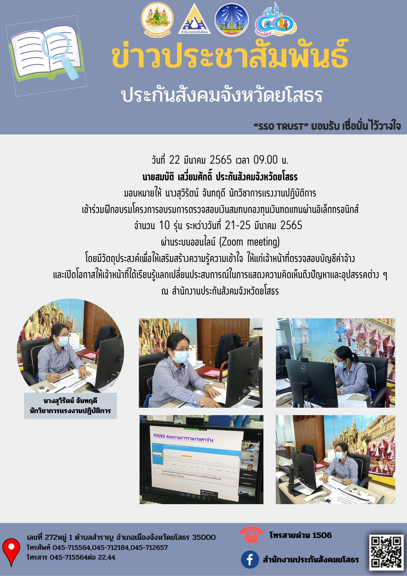 วันที่ 22 มีนาคม 2565 เวลา 09.00 น. นายสมบัติ เสงี่ยมศักดิ์ ประกันสังคมจังหวัดยโสธร มอบหมายให้ นางสุวิรัตน์ จันทฤดี นักวิชาการเเรงงานปฏิบัติการ เข้าร่วมฝึกอบรมโครงการอบรมการตรวจสอบเงินสมทบกองทุนเงินทดแทนผ่านอิเล็กทรอนิกส์ จำนวน 10 รุ่น ระหว่างวันที่