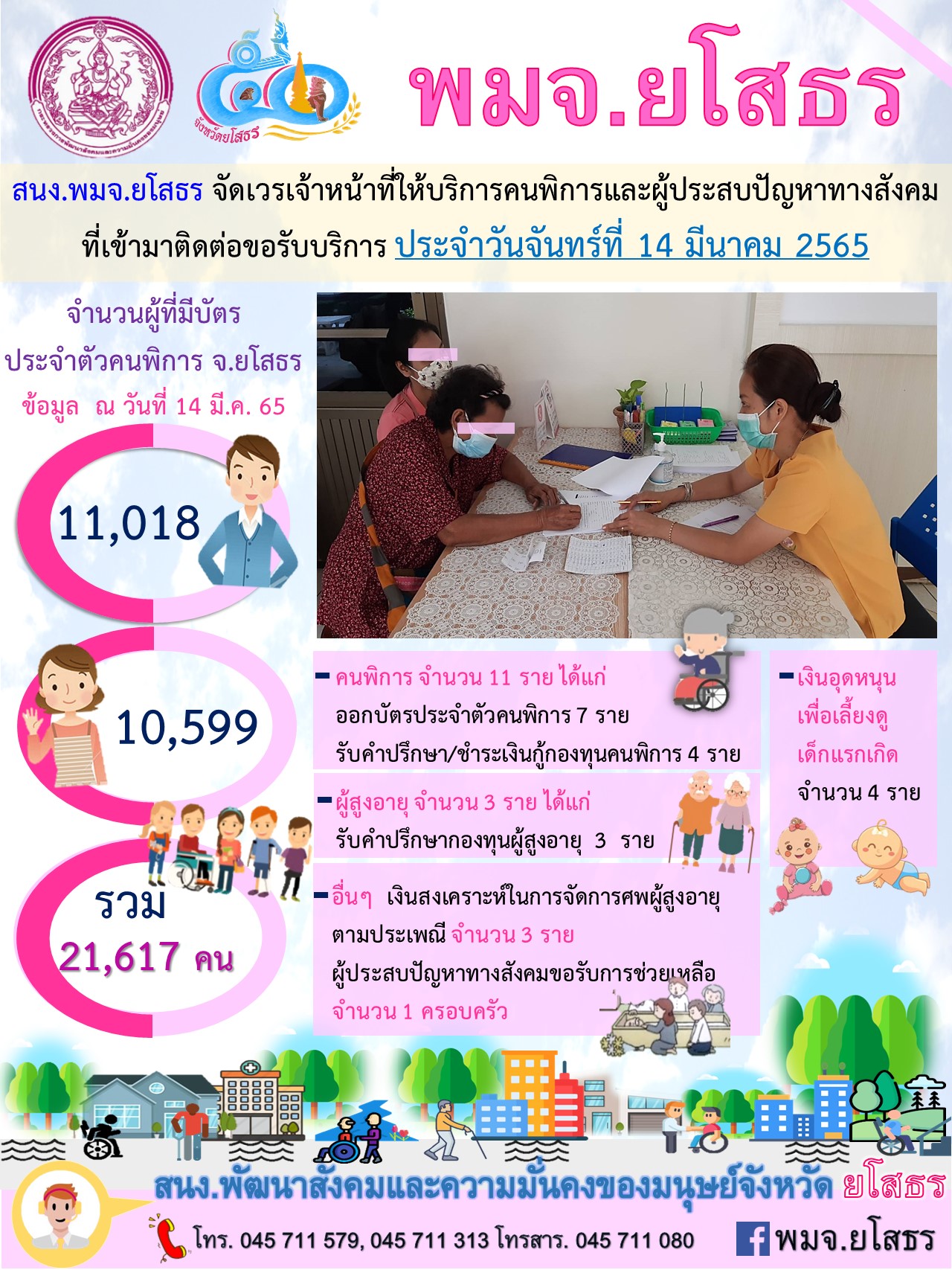 สนง.พมจ.ยโสธร จัดเวรเจ้าหน้าที่ให้บริการคนพิการและผู้ประสบปัญหาทางสังคม ที่เข้ามาติดต่อขอรับบริการ (14 มีนาคม 2565)