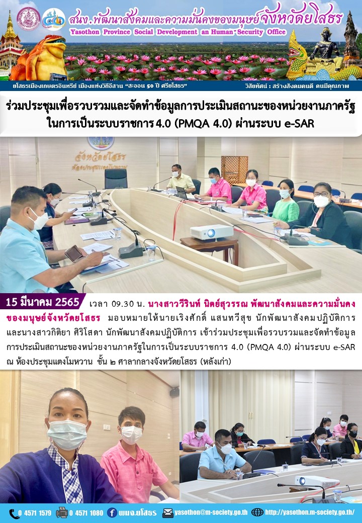 วันที่ 22 มี.ค. 2565 (20:54 น.)วันที่ 15 มีนาคม 2565 เวลา 09.30 น. นางสาววีรินท์ นิตย์สุวรรณ พัฒนาสังคมและความมั่นคงของมนุษย์จังหวัดยโสธร มอบหมายให้นายเริงศักดิ์ แสนทวีสุข นักพัฒนาสังคมปฏิบัติการ และนางสาวกิติยา ศิริโสดา นักพัฒนาสังคมปฏิบัติการ เข้าร่วมประชุมเพื่อรวบรวมและจัดทำข้อมูลการประเมินสถานะของหน่วยงานภาครัฐในการเป็นระบบราชการ 4.0 (PMQA 4.0) ผ่านระบบ e-SAR ณ ห้องประชุมแตงโมหวาน ชั้น ๒ ศาลากลางจังหวัดยโสธร (หลังเก่า)