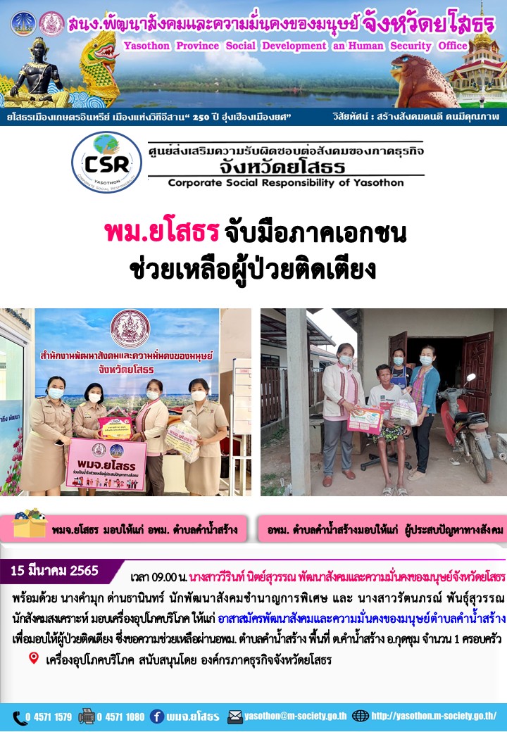 พม.ยโสธร จับมือภาคเอกชนช่วยเหลือผู้ป่วยติดเตียง (15 มีนาคม 2565)