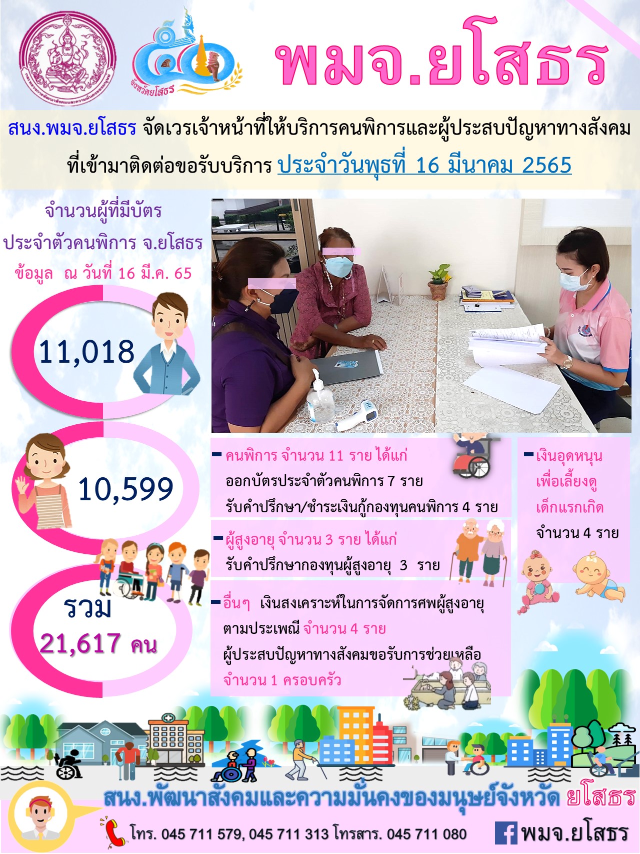 สนง.พมจ.ยโสธร จัดเวรเจ้าหน้าที่ให้บริการคนพิการและผู้ประสบปัญหาทางสังคม ที่เข้ามาติดต่อขอรับบริการ (16 มีนาคม 2565)