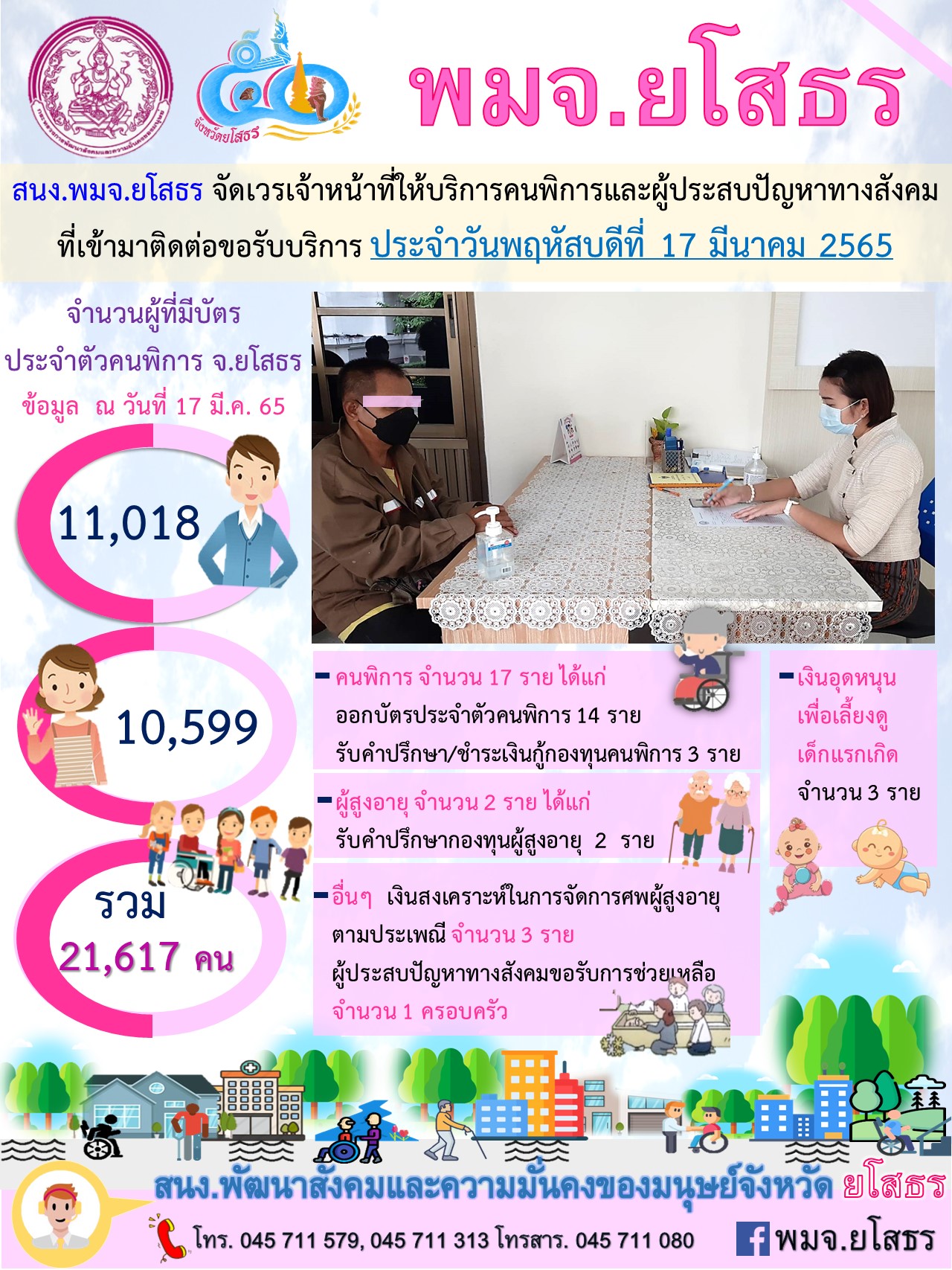 สนง.พมจ.ยโสธร จัดเวรเจ้าหน้าที่ให้บริการคนพิการและผู้ประสบปัญหาทางสังคม ที่เข้ามาติดต่อขอรับบริการ (17 มีนาคม 2565)