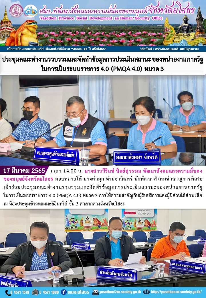 ประชุมคณะทำงานรวบรวมและจัดทำข้อมูลการประเมินสถานะของหน่วยงานภาครัฐในการเป็นระบบราชการ 4.0 (PMQA 4.0) หมวด 3 (17 มีนาคม 2565)