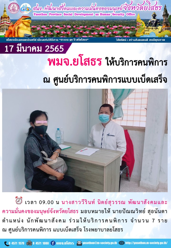 พม.ยโสธร ให้บริการคนพิการ ณ ศูนย์บริการคนพิการแบบเบ็ดเสร็จ (17 มีนาคม 2565)
