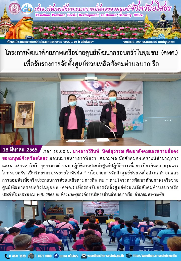 วันที่ 22 มี.ค. 2565 (21:43 น.)วันที่ 18 มีนาคม 2565 เวลา 10.00 น. นางสาววีรินท์ นิตย์สุวรรณ พัฒนาสังคมและความมั่นคง ของมนุษย์จังหวัดยโสธร มอบหมายนางสาวพัชรา สนามพล นักสังคมสงเคราะห์ชำนาญการ และนางสาวสาวิตรี อุตอามาตย์ จนท.ปฏิบัติงานประจำศูนย์ปฏิบัติการเพื่อการป้องกันความรุนแรงในครอบครัว เป็นวิทยากรบรรยายในหัวข้อ “ นโยบายการจัดตั้งศูนย์ช่วยเหลือสังคมตำบลและการสอบข้อเท็จจริงประกอบการช่วยเหลือตามภารกิจ พม.” ตามโครงการพัฒนาศักยภาพเครือข่ายศูนย์พัฒนาครอบครัวในชุมชน (ศพค.) เพื่อรองรับการจัดตั้งศูนย์ช่วยเหลือสังคมตำบลบากเรือ ประจำปีงบประมาณ พ.ศ. 2565 ณ ห้องประชุมองค์การบริหารส่วนตำบลบากเรือ อำเภอมหาชนะชัย