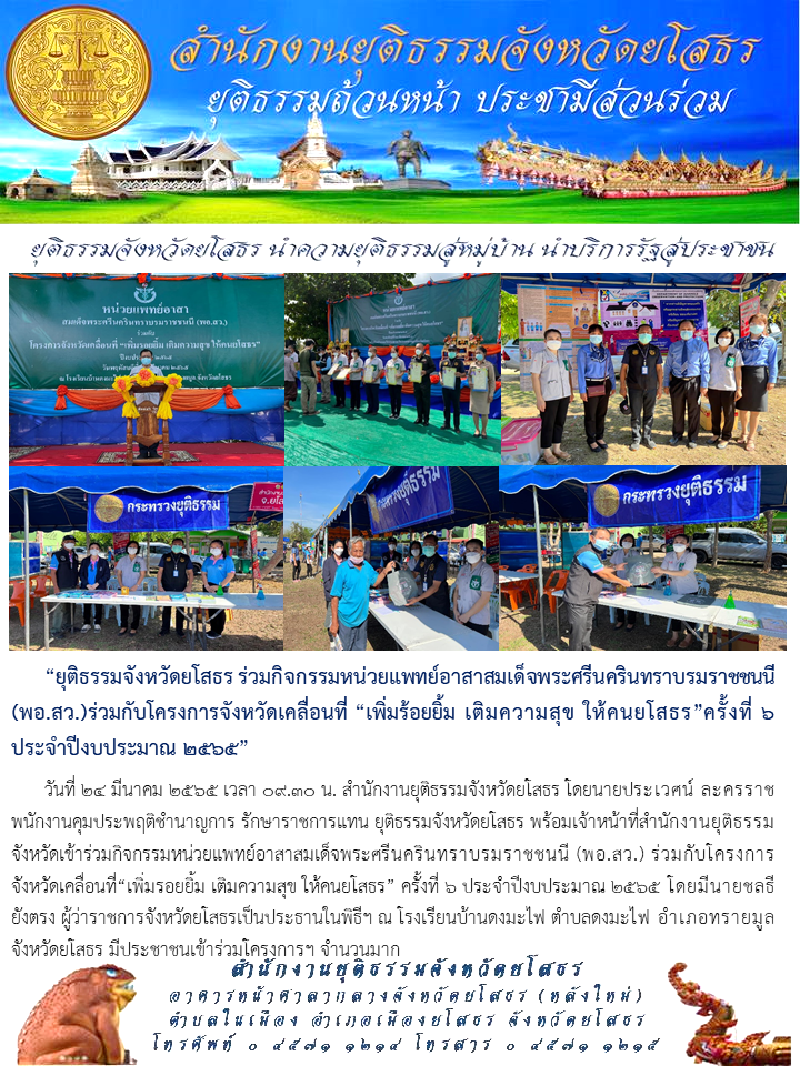 “ยุติธรรมจังหวัดยโสธร ร่วมกิจกรรมหน่วยแพทย์อาสาสมเด็จพระศรีนครินทราบรมราชชนนี (พอ.สว.)ร่วมกับโครงการจังหวัดเคลื่อนที่ “เพิ่มร้อยยิ้ม เติมความสุข ให้คนยโสธร”ครั้งที่ ๖ ประจำปีงบประมาณ ๒๕๖๕”