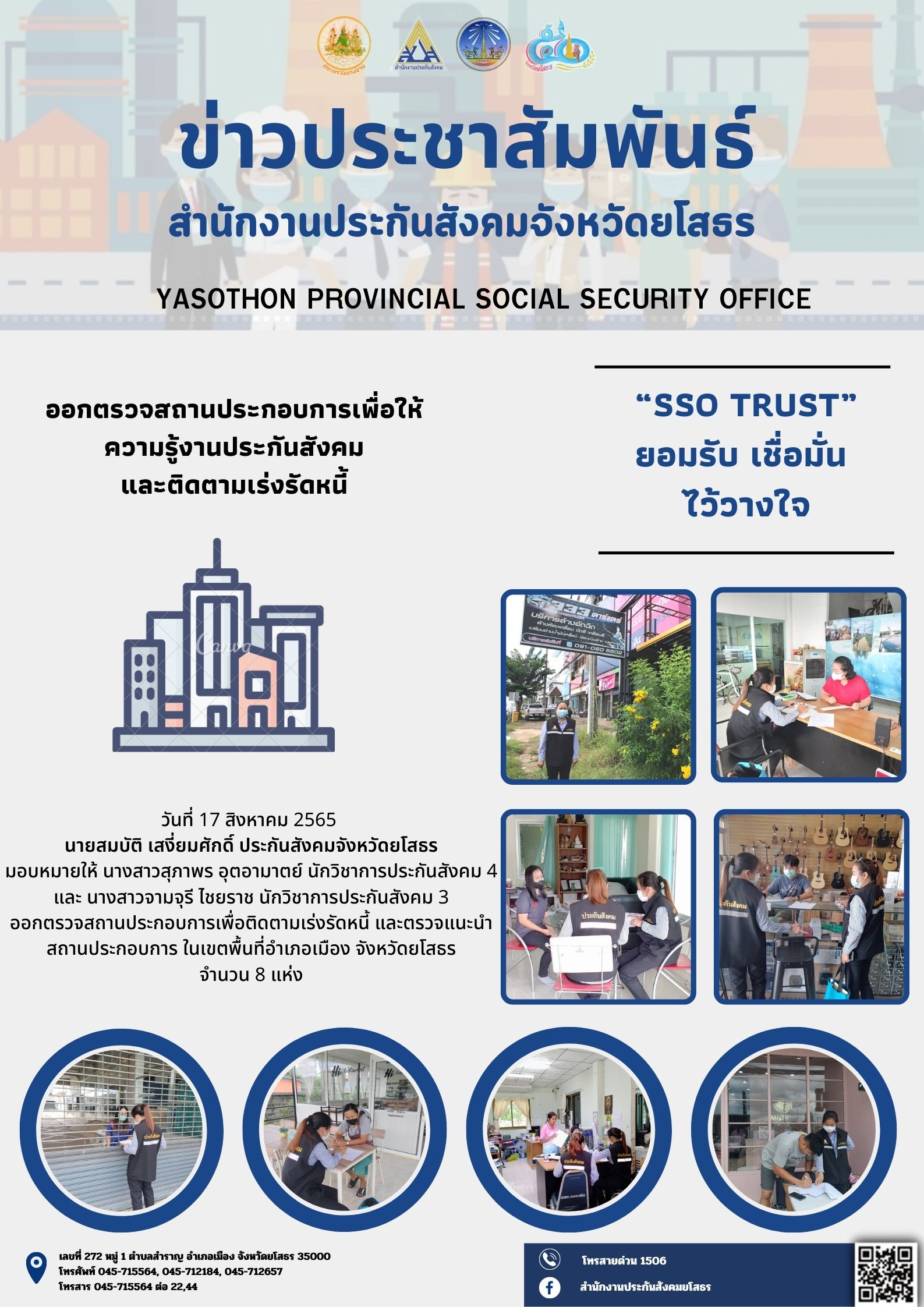 วันที่ 24 มี.ค. 2565 (17:00 น.)วันที่ 24 มีนาคม 2565 นายสมบัติ เสงี่ยมศักดิ์ ประกันสังคมจังหวัดยโสธร
