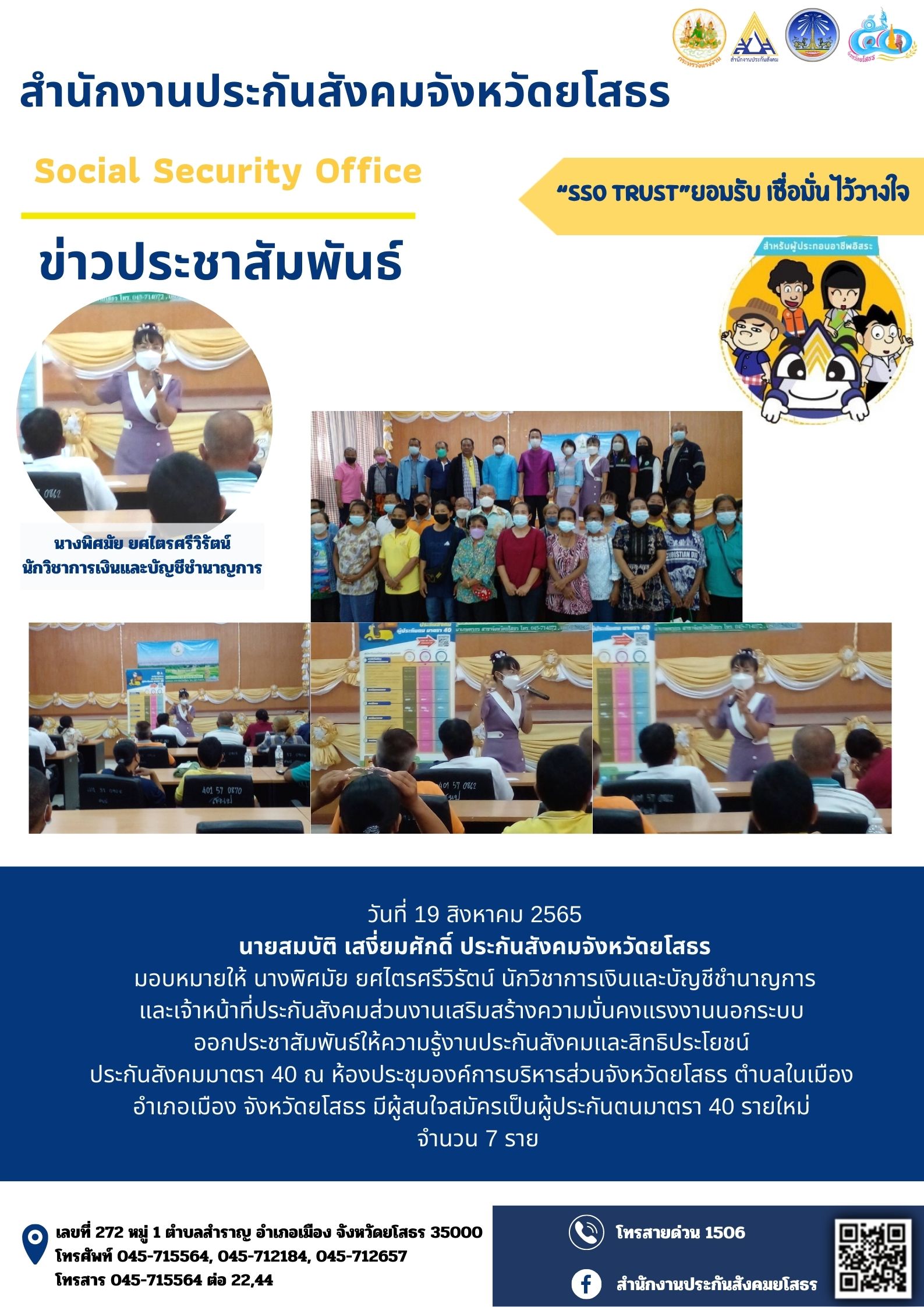 วันที่ 24 มี.ค. 2565 (17:01 น.)วันที่ 24 มีนาคม 2565 นายสมบัติ เสงี่ยมศักดิ ประกันสังคมจังหวัดยโสธร