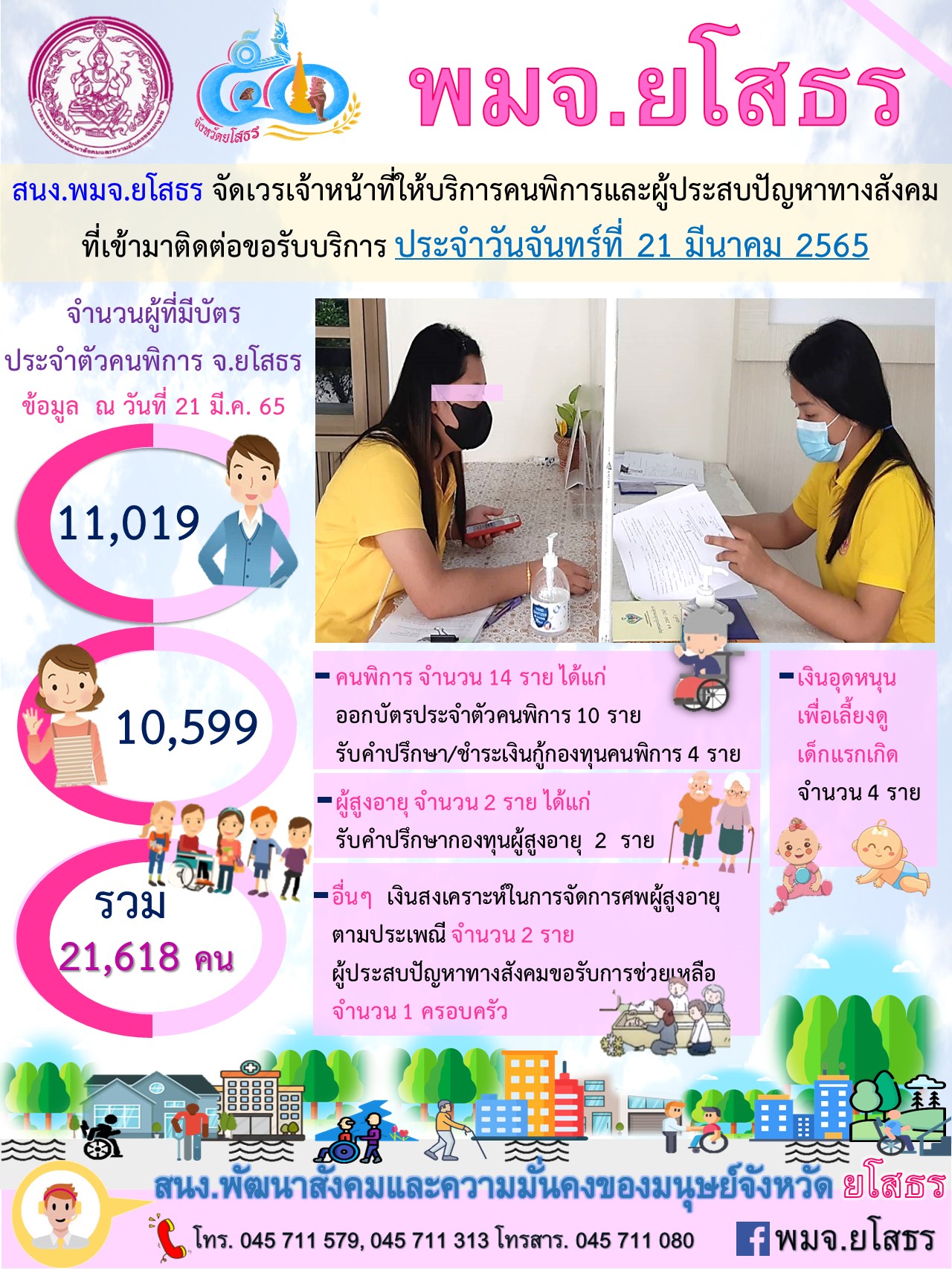 สนง.พมจ.ยโสธร จัดเวรเจ้าหน้าที่ให้บริการคนพิการและผู้ประสบปัญหาทางสังคม ที่เข้ามาติดต่อขอรับบริการ (21 มีนาคม 2565)