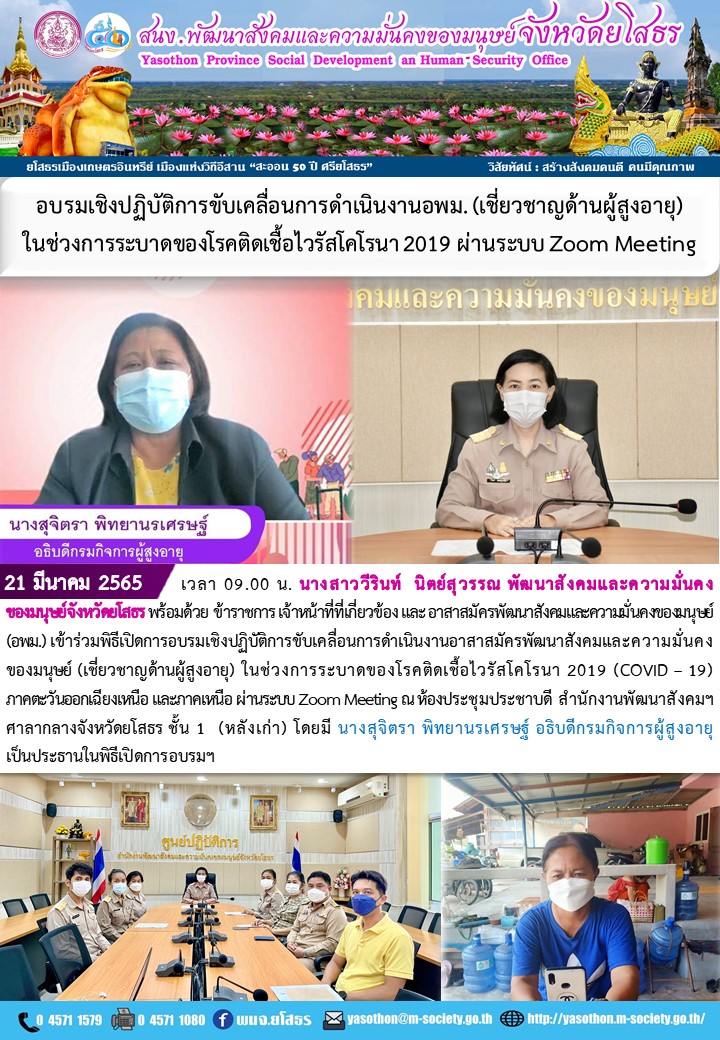 วันที่ 25 มี.ค. 2565 (08:38 น.)วันที่ 21 มีนาคม 2565 เวลา 09.00 น. นางสาววีรินท์ นิตย์สุวรรณ พัฒนาสังคมและความมั่นคงของมนุษย์จังหวัดยโสธร พร้อมด้วย ข้าราชการ เจ้าหน้าที่ที่เกี่ยวข้องและอาสาสมัครพัฒนาสังคมและความมั่นคงของมนุษย์ (อพม.) เข้าร่วมพิธีเปิดการอบรมเชิงปฏิบัติการขับเคลื่อนการดำเนินงานอาสาสมัครพัฒนาสังคมและความมั่นคงของมนุษย์ (เชี่ยวชาญด้านผู้สูงอายุ) ในช่วงการระบาดของโรคติดเชื้อไวรัสโคโรนา 2019 (COVID – 19) ภาคตะวันออกเฉียงเหนือ และภาคเหนือ ผ่านระบบ Zoom Meeting ณ ห้องประชุมประชาบดี สำนักงานพัฒนาสังคมฯ ศาลากลางจังหวัดยโสธร ชั้น 1 (หลังเก่า) โดยมี นางสุจิตรา พิทยานรเศรษฐ์ อธิบดีกรมกิจการผู้สูงอายุ เป็นประธานในพิธีเปิดการอบรมฯ