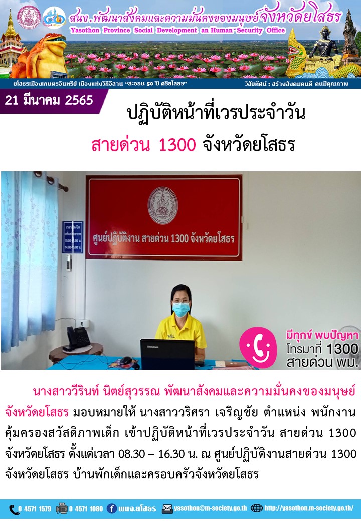 ปฏิบัติหน้าที่เวรประจำวันสายด่วน 1300 จังหวัดยโสธร (21 มีนาคม 2565)
