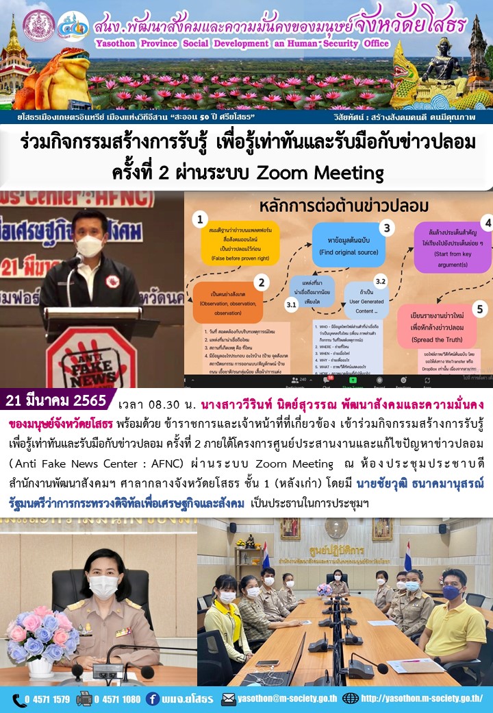 วันที่ 25 มี.ค. 2565 (08:49 น.)วันที่ 21 มีนาคม 2565 เวลา 08.30 น. นางสาววีรินท์ นิตย์สุวรรณ พัฒนาสังคมและความมั่นคงของมนุษย์จังหวัดยโสธร พร้อมด้วย ข้าราชการและเจ้าหน้าที่ที่เกี่ยวข้อง เข้าร่วมกิจกรรมสร้างการรับรู้เพื่อรู้เท่าทันและรับมือกับข่าวปลอม ครั้งที่ 2 ภายใต้โครงการศูนย์ประสานงานและแก้ไขปัญหาข่าวปลอม (Anti Fake News Center : AFNC) ผ่านระบบ Zoom Meeting ณ ห้องประชุมประชาบดี สำนักงานพัฒนาสังคมฯ ศาลากลางจังหวัดยโสธร ชั้น 1 (หลังเก่า) โดยมี นายชัยวุฒิ ธนาคมานุสรณ์ รัฐมนตรีว่าการกระทรวงดิจิทัลเพื่อเศรษฐกิจและสังคม เป็นประธานในการประชุมฯ