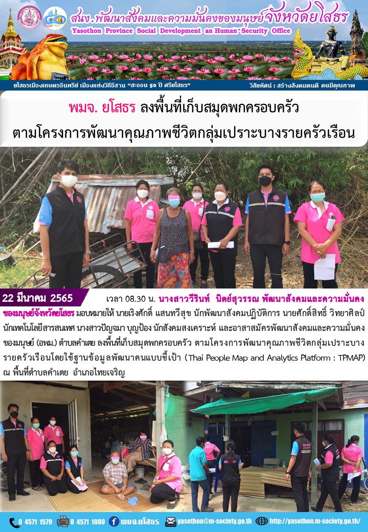 วันที่ 25 มี.ค. 2565 (08:58 น.)วันที่ 22 มีนาคม 2565 เวลา 08.30 น. นางสาววีรินท์ นิตย์สุวรรณ พัฒนาสังคมและความมั่นคงของมนุษย์จังหวัดยโสธร มอบหมายให้ นายเริงศักดิ์ แสนทวีสุข นักพัฒนาสังคมปฏิบัติการ นายศักดิ์สิทธิ์ วิทยาศิลป์ นักเทคโนโลยีสารสนเทศ นางสาวปัญจมา บุญป้อง นักสังคมสงเคราะห์ และอาสาสมัครพัฒนาสังคมและความมั่นคงของมนุษย์ (อพม.) ตำบลคำเตย ลงพื้นที่เก็บสมุดพกครอบครัว ตามโครงการพัฒนาคุณภาพชีวิตกลุ่มเปราะบาง รายครัวเรือนโดยใช้ฐานข้อมูลพัฒนาคนแบบชี้เป้า (Thai People Map and Analytics Platform : TPMAP) ณ พื้นที่ตำบลคำเตย อำเภอไทยเจริญ