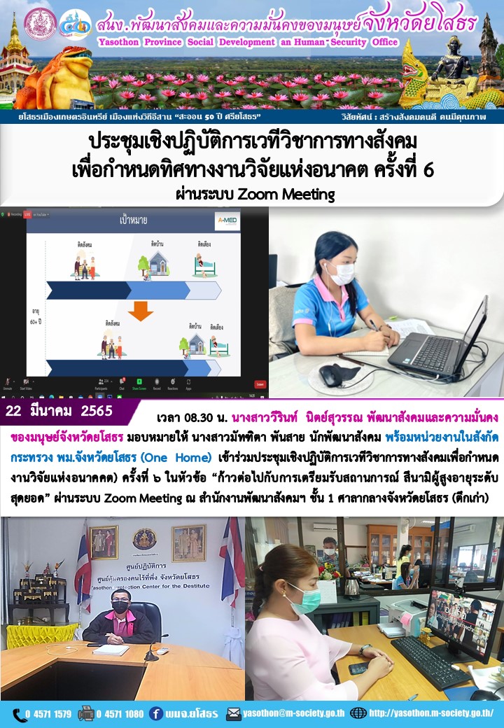 วันที่ 25 มี.ค. 2565 (09:04 น.)วันที่ 22 มีนาคม 2565 เวลา 08.30 น. นางสาววีรินท์ นิตย์สุวรรณ พัฒนาสังคมและความมั่นคงของมนุษย์จังหวัดยโสธร มอบหมายให้ นางสาวมัทฑิตา พันสาย นักพัฒนาสังคม พร้อมหน่วยงานในสังกัดกระทรวง พม.จังหวัดยโสธร (One Home) เข้าร่วมประชุมเชิงปฏิบัติการเวทีวิชาการทางสังคมเพื่อกำหนดงานวิจัยแห่งอนาคต) ครั้งที่ - ในหัวข้อ "ก้าวต่อไปกับการเตรียมรับสถานการณ์ สึนามิผู้สูงอายุระดับสุดยอด ผ่านระบบ Zoom Meeting ณ สำนักงานพัฒนาสังคมฯ ชั้น 1 ศาลากลางจังหวัดยโสธร (ตึกเก่า)