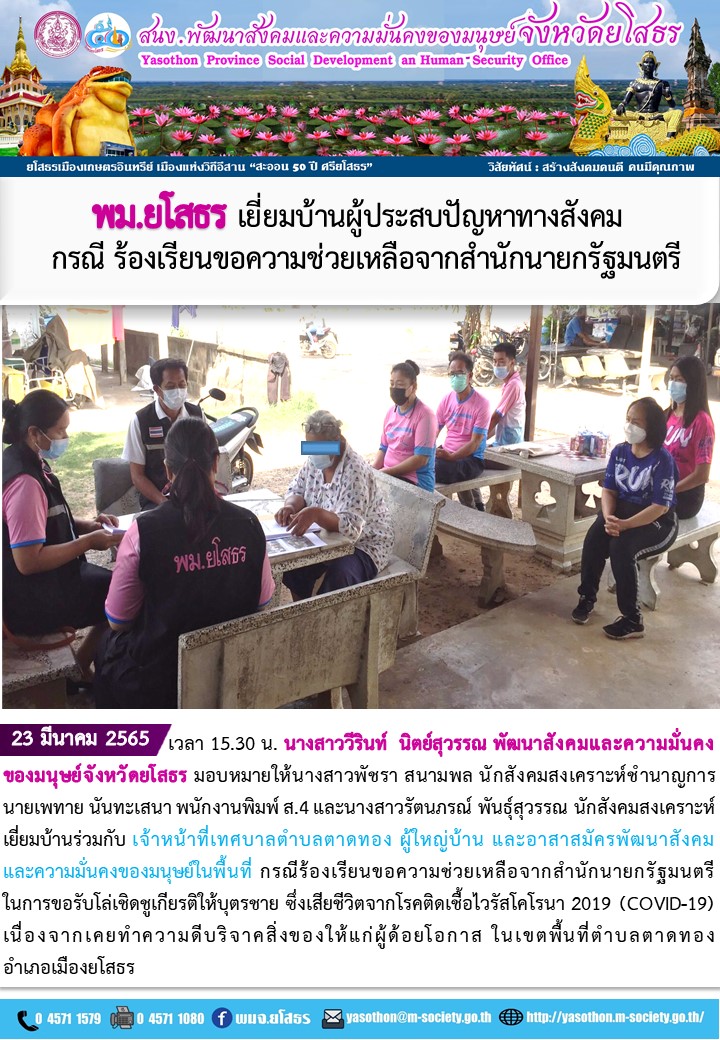 พม.ยโสธร เยี่ยมบ้านผู้ประสบปัญหาทางสังคม กรณี ร้องเรียนขอความช่วยเหลือจากสำนักนายกรัฐมนตรี (23 มีนาคม 2565)