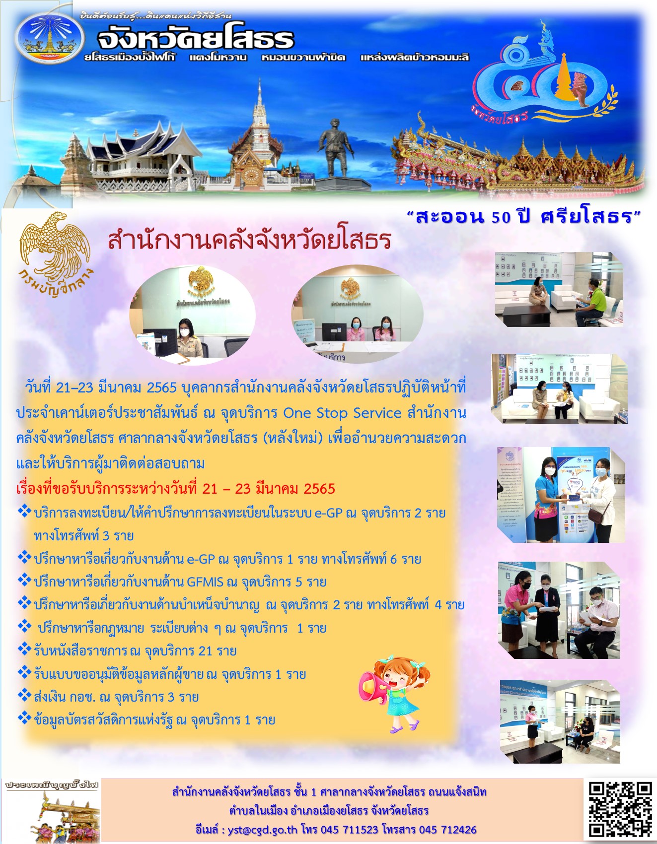 วันที่ 21–23 มีนาคม 2565 บุคลากรสำนักงานคลังจังหวัดยโสธรปฏิบัติหน้าที่ประจำเคาน์เตอร์ประชาสัมพันธ์ ณ จุดบริการ One Stop Service สำนักงานคลังจังหวัดยโสธร ศาลากลางจังหวัดยโสธร (หลังใหม่) เพื่ออำนวยความสะดวกและให้บริการผู้มาติดต่อสอบถาม