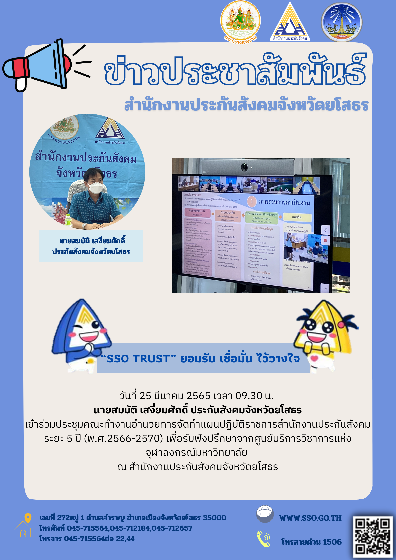 วันที่ 25 มีนาคม 2565 เวลา 09.30 น. นายสมบัติ เสงี่ยมศักดิ์ ประกันสังคมจังหวัดยโสธร เข้าร่วมประชุมคณะทำงานอำนวยการจัดทำแผนปฏิบัติราชการสำนักงานประกันสังคม ระยะ 5 ปี (พ.ศ.2566-2570)