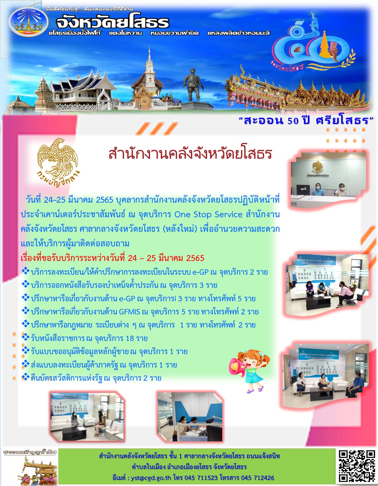 วันที่ 24–25 มีนาคม 2565 บุคลากรสำนักงานคลังจังหวัดยโสธรปฏิบัติหน้าที่ประจำเคาน์เตอร์ประชาสัมพันธ์ ณ จุดบริการ One Stop Service สำนักงานคลังจังหวัดยโสธร ศาลากลางจังหวัดยโสธร (หลังใหม่) เพื่ออำนวยความสะดวกและให้บริการผู้มาติดต่อสอบถาม