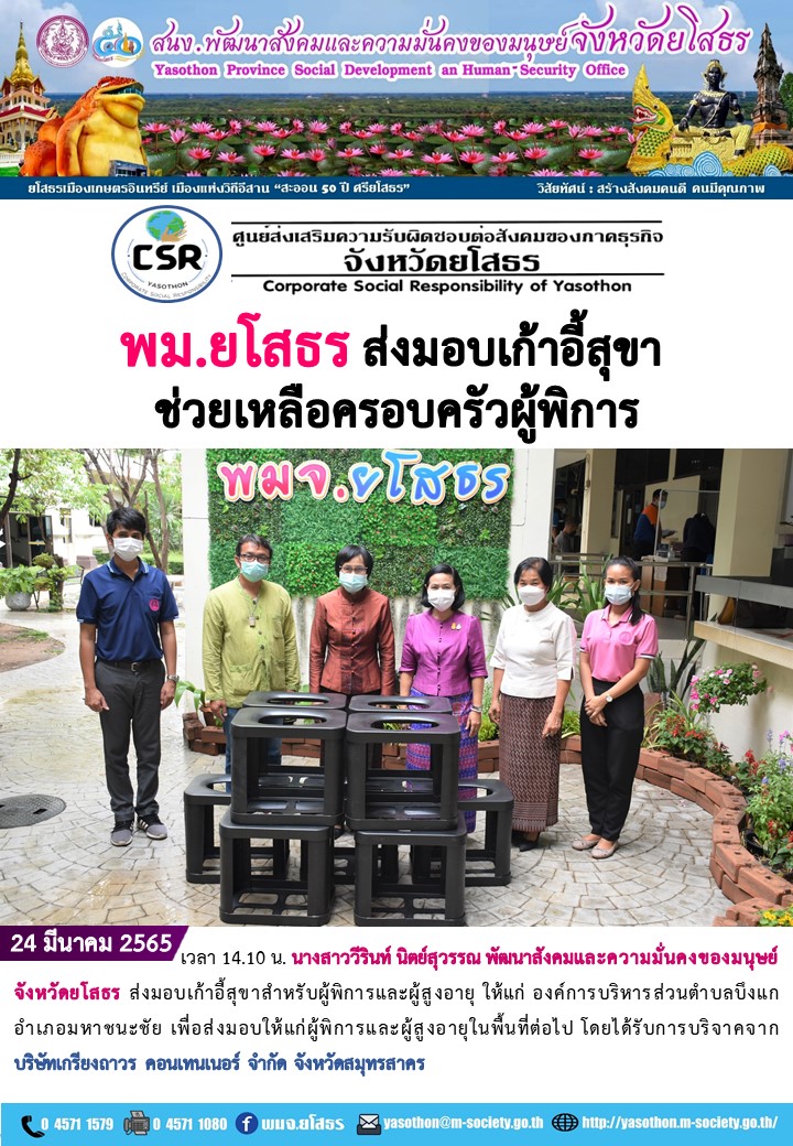 วันที่ 28 มี.ค. 2565 (15:33 น.)วันที่ 24 มีนาคม 2565 เวลา 14.10 น. นางสาววีรินท์ นิตย์สุวรรณ พัฒนาสังคมและความมั่นคงของมนุษย์จังหวัดยโสธร ส่งมอบเก้าอี้สุขาสำหรับผู้พิการและผู้สูงอายุ ให้แก่ องค์การบริหารส่วนตําบลบึงแก อําเภอมหาชนะชัย เพื่อส่งมอบให้แก่ผู้พิการและผู้สูงอายุในพื้นที่ต่อไป โดยได้รับการบริจาคจาก บริษัทเกรียงถาวร คอนเทนเนอร์ จำกัด จังหวัดสมุทรสาคร