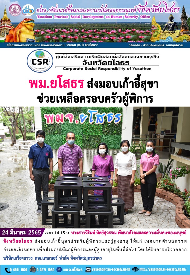 วันที่ 28 มี.ค. 2565 (15:35 น.)วันที่ 24 มีนาคม 2565 เวลา 14.15 น. นางสาววีรินท์ นิตย์สุวรรณ พัฒนาสังคมและความมั่นคงของมนุษย์จังหวัดยโสธร ส่งมอบเก้าอี้สุขาสำหรับผู้พิการและผู้สูงอายุ ให้แก่ เทศบาลตำบลสวาท อําเภอเลิงนกทา เพื่อส่งมอบให้แก่ผู้พิการและผู้สูงอายุในพื้นที่ต่อไป โดยได้รับการบริจาคจาก บริษัทเกรียงถาวร คอนเทนเนอร์ จำกัด จังหวัดสมุทรสาคร