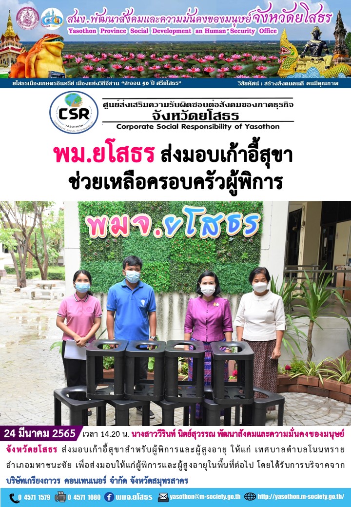 พม.ยโสธร ส่งมอบเก้าอี้สุขาช่วยเหลือครอบครัวผู้พิการ เทศบาลตำบลโนนทราย อําเภอมหาชนะชัย (24 มีนาคม 2565)