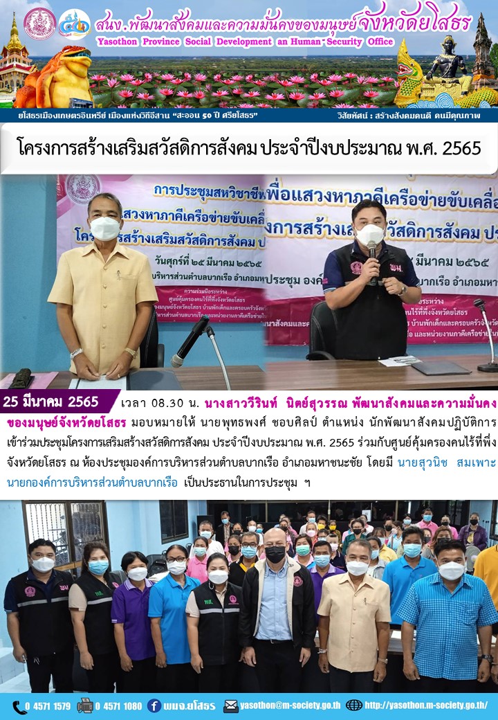 วันที่ 28 มี.ค. 2565 (16:19 น.)วันที่ 25 มีนาคม 2565 เวลา 08.30 น. นางสาววีรินท์ นิตย์สุวรรณ พัฒนาสังคมและความมั่นคง ของมนุษย์จังหวัดยโสธร มอบหมายให้ นายพุทธพงศ์ ชอบศิลป์ ตำแหน่ง นักพัฒนาสังคมปฏิบัติการ เข้าร่วมประชุมโครงการเสริมสร้างสวัสดิการสังคม ประจำปีงบประมาณ พ.ศ. 2565 ร่วมกับศูนย์คุ้มครองคนไร้ที่พึ่งจังหวัดยโสธร ณ ห้องประชุมองค์การบริหารส่วนตำบลบากเรือ อำเภอมหาชนะชัย โดยมี นายสุวนิช สมเพาะ นายกองค์การบริหารส่วนตำบลบากเรือ เป็นประธานในการประชุม ฯ