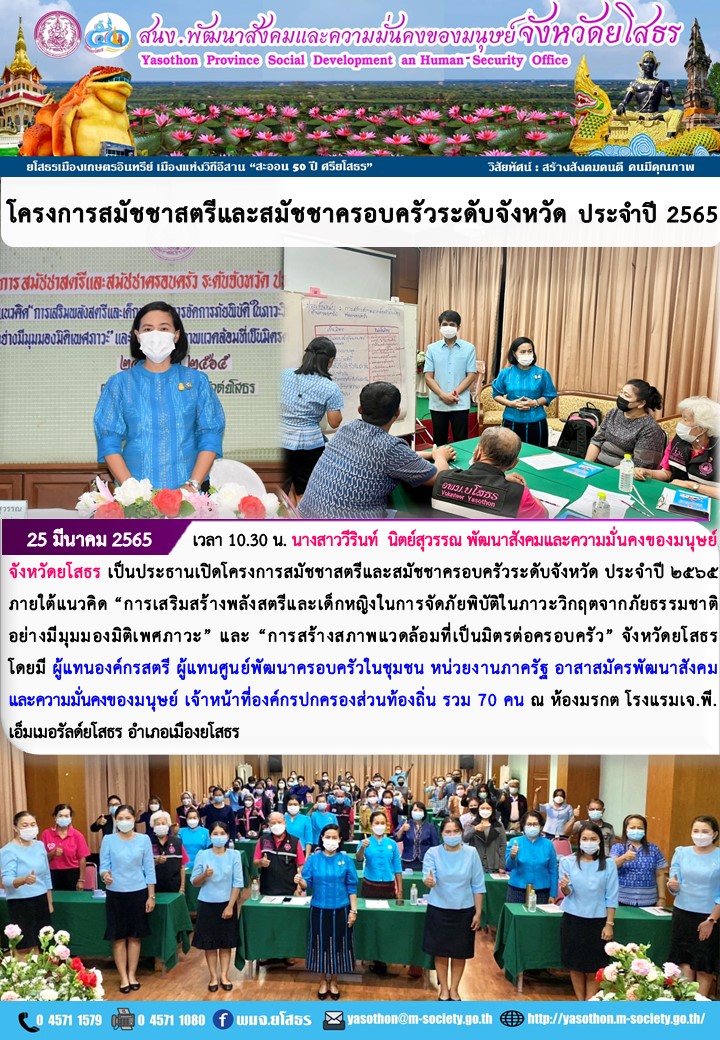 วันที่ 28 มี.ค. 2565 (16:21 น.)วันที่ 25 มีนาคม 2565 เวลา 10.30 น. นางสาววีรินท์ นิตย์สุวรรณ พัฒนาสังคมและความมั่นคงของมนุษย์จังหวัดยโสธร เป็นประธานในพิธีเปิดโครงการสมัชชาสตรีและสมัชชาครอบครัวระดับจังหวัด ประจำปี ๒๕๖๕ ภายใต้แนวคิด “การเสริมสร้างพลังสตรี ละเด็กหญิงในการจัดภัยพิบัติในภาวะวิกฤตจากภัยธรรมชาติอย่างมีมุมมองมิติเพศภาวะ” และ “การสร้างสภาพแวดล้อมที่เป็นมิตรต่อครอบครัว” จังหวัดยโสธร โดยมี ผู้แทนองค์กรสตรี ผู้แทนศูนย์พัฒนาครอบครัวในชุมชน หน่วยงานภาครัฐ อาสาสมัครพัฒนาสังคมและความมั่นคงของมนุษย์ เจ้าหน้าที่องค์กรปกครองส่วนท้องถิ่น รวม 70 คน ณ ห้องมรกต โรงแรมเจ.พี.เอ็มเมอรัลด์ยโสธร