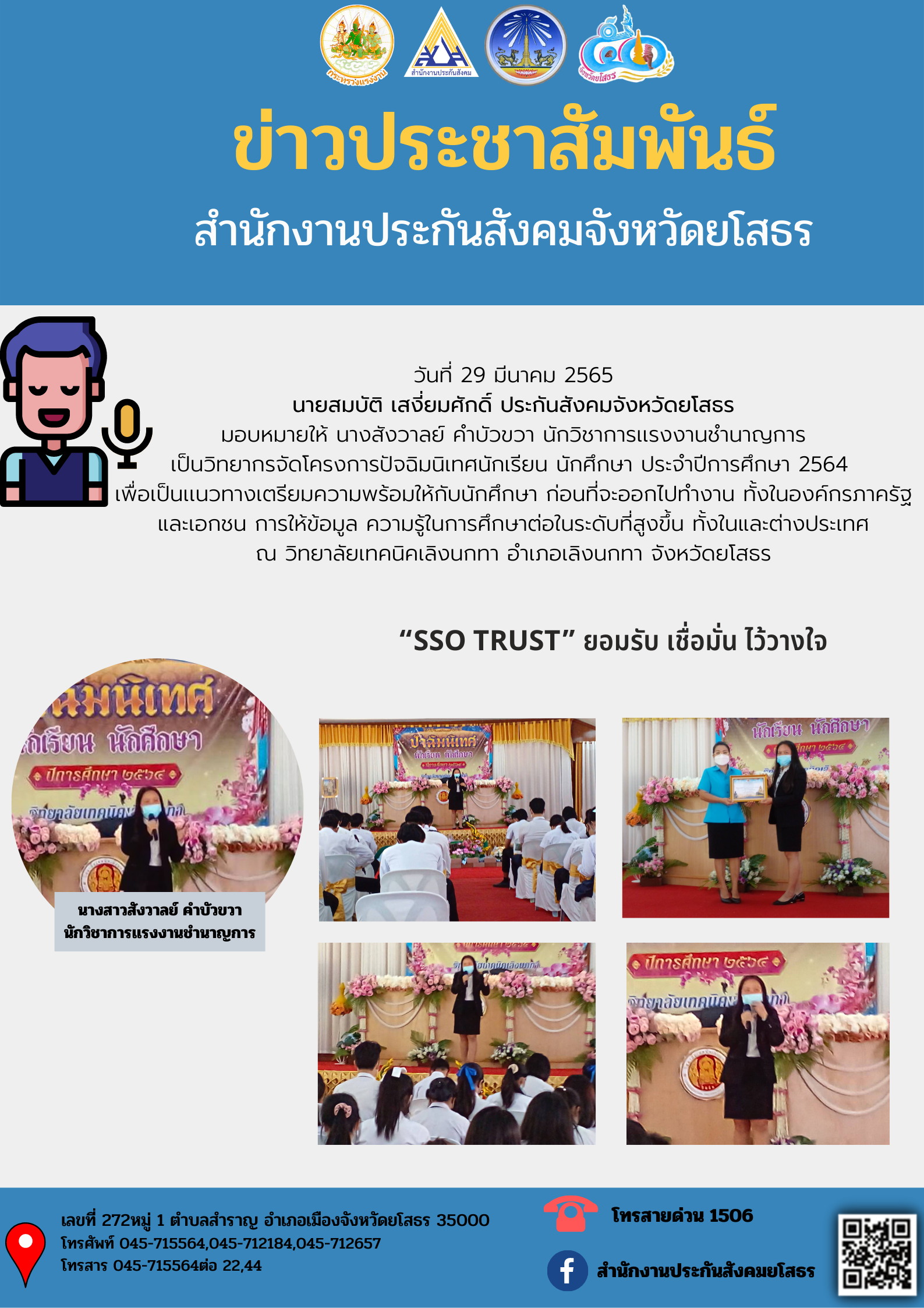 วันที่ 29 มีนาคม 2565 นายสมบัติ เสงี่ยมศักดิ์ ประกันสังคมจังหวัดยโสธร มอบหมายให้ นางสังวาลย์ คำบัวขวา นักวิชาการเเรงงานชำนาญการ เป็นวิทยากรจัดโครงการปัจฉิมนิเทศนักเรียน นักศึกษา ประจำปีการศึกษา 2564