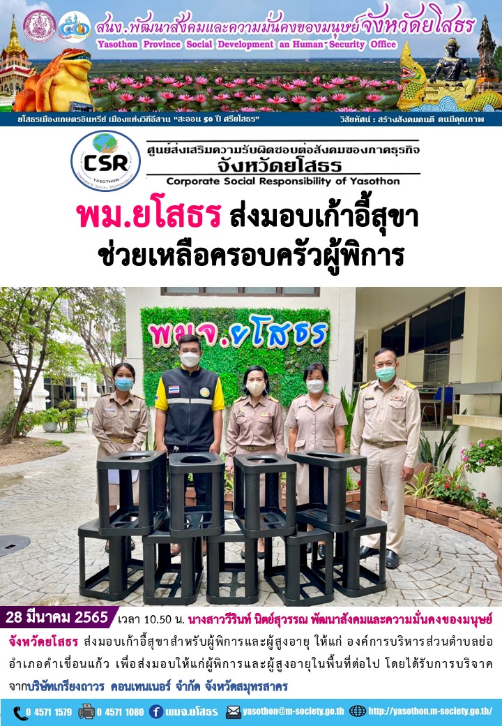 วันที่ 3 เม.ย. 2565 (19:30 น.)วันที่ 28 มีนาคม 2565 เวลา 10.50 น. นางสาววีรินท์ นิตย์สุวรรณ พัฒนาสังคมและความมั่นคงของมนุษย์จังหวัดยโสธร ส่งมอบเก้าอี้สุขาสำหรับผู้พิการและผู้สูงอายุ ให้แก่ องค์การบริหารส่วนตําบลย่อ อําเภอคำเขื่อนแก้ว เพื่อส่งมอบให้แก่ผู้พิการและผู้สูงอายุในพื้นที่ต่อไป โดยได้รับการบริจาคจากบริษัทเกรียงถาวร คอนเทนเนอร์ จำกัด จังหวัดสมุทรสาคร
