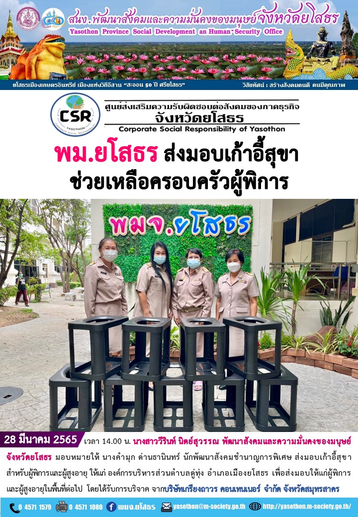 พม.ยโสธร ส่งมอบเก้าอี้สุขาช่วยเหลือครอบครัวผู้พิการ องค์การบริหารส่วนตําบลดู่ทุ่ง อําเภอเมืองยโสธร (28 มีนาคม 2565)