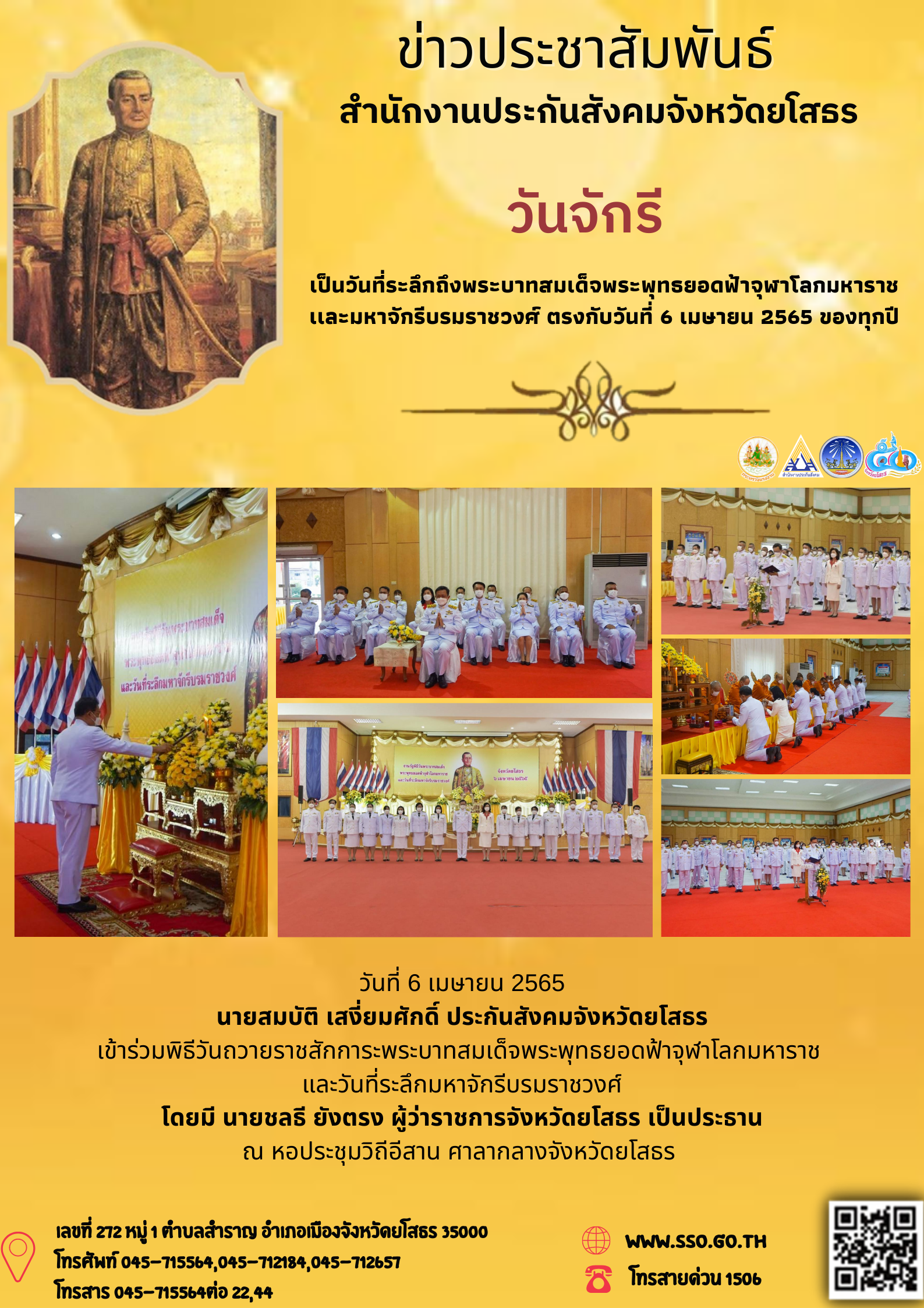 วันที่ 6 เมษายน 2565 นายสมบัติ เสงี่ยมศักดิ์ ประกันสังคมจังหวัดยโสธร เข้าร่วมพิธีวันถวายราชสักการะพระบาทสมเด็จพระพุทธยอดฟ้าจุฬาโลกมหาราช และวันที่ระลึกมหาจักรีบรมราชวงศ์