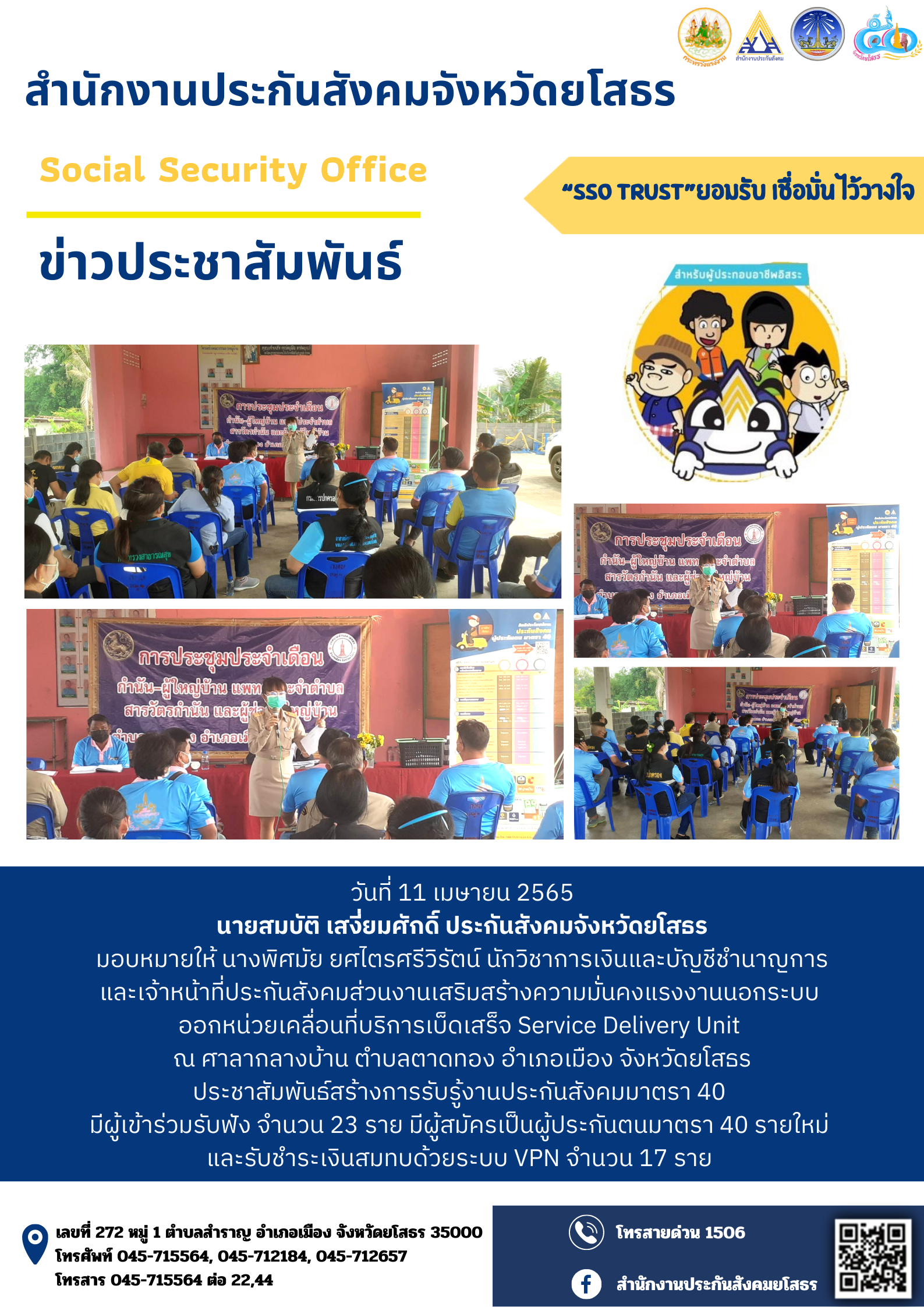 วันที่ 11 เมษายน 2565 นายสมบัติ เสงี่ยมศักดิ์ ประกันสังคมจังหวัดยโสธร มอบหมายให้เจ้าหน้าที่ สสร. ออกหน่วยเคลื่อนที่บริการเบ็ดเสร็จ SERVICE DELIVERY UNIT