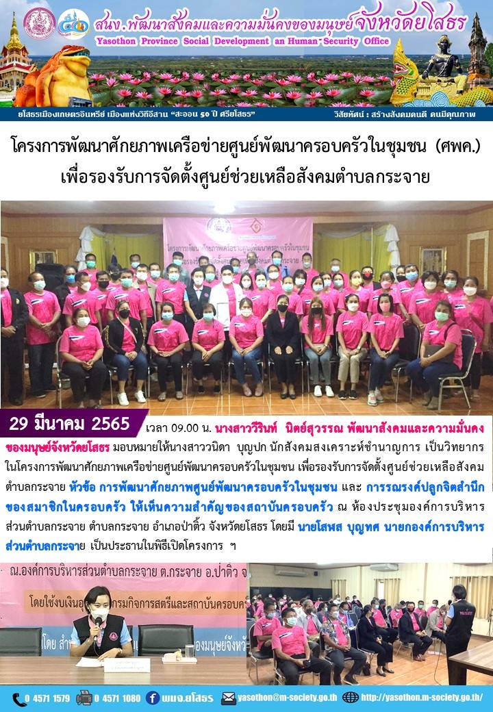 โครงการพัฒนาศักยภาพเครือข่ายศูนย์พัฒนาครอบครัวในชุมชน (ศพค.) เพื่อรองรับการจัดตั้งศูนย์ช่วยเหลือสังคมตำบลกระจาย (29 มีนาคม 2565)