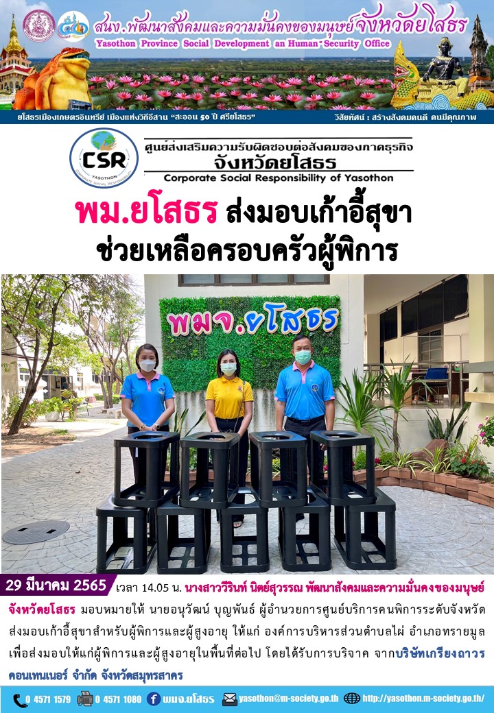 วันที่ 18 เม.ย. 2565 (14:20 น.)วันที่ 29 มีนาคม 2565 เวลา 14.05 น. นางสาววีรินท์ นิตย์สุวรรณ พัฒนาสังคมและความมั่นคงของมนุษย์จังหวัดยโสธร มอบหมายให้ นายอนุวัฒน์ บุญพันธ์ ผู้อำนวยการศูนย์บริการคนพิการระดับจังหวัด ส่งมอบเก้าอี้สุขาสำหรับผู้พิการและผู้สูงอายุ ให้แก่ องค์การบริหารส่วนตําบลไผ่ อําเภอทรายมูล เพื่อส่งมอบให้แก่ผู้พิการและผู้สูงอายุในพื้นที่ต่อไป โดยได้รับการบริจาค จากบริษัทเกรียงถาวร คอนเทนเนอร์ จำกัด จังหวัดสมุทรสาคร