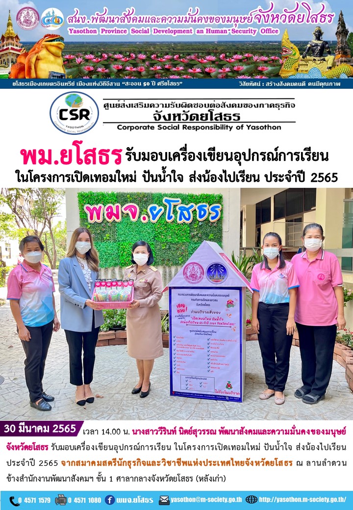 พม.ยโสธร รับมอบเครื่องเขียนอุปกรณ์การเรียนในโครงการเปิดเทอมใหม่ ปันน้ำใจ ส่งน้องไปเรียน ประจำปี 2565 (30 มีนาคม 2565)
