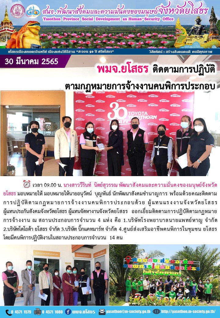 พมจ.ยโสธร ติดตามการปฏิบัติตามกฎหมายการจ้างงานคนพิการ (30 มีนาคม 2565)