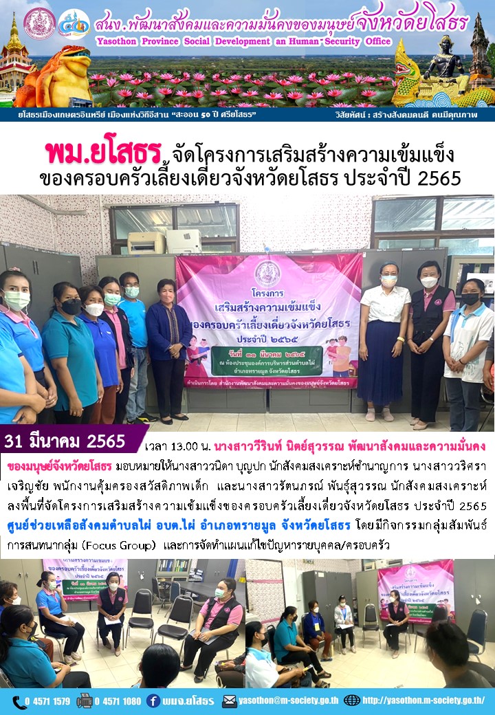พม.ยโสธร จัดโครงการเสริมสร้างความเข้มแข็งของครอบครัวเลี้ยงเดี่ยวจังหวัดยโสธร ประจำปี 2565 ณ ศูนย์ช่วยเหลือสังคมตำบลไผ่ อบต.ไผ่ (31 มีนาคม 2565)