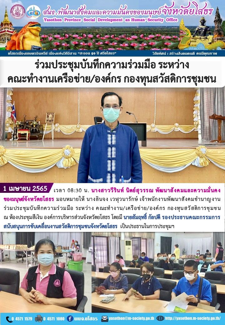 ร่วมประชุมบันทึกความร่วมมือ ระหว่าง คณะทำงาน/เครือข่าย/องค์กร กองทุนสวัสดิการชุมชน (1 เมษายน 2565)