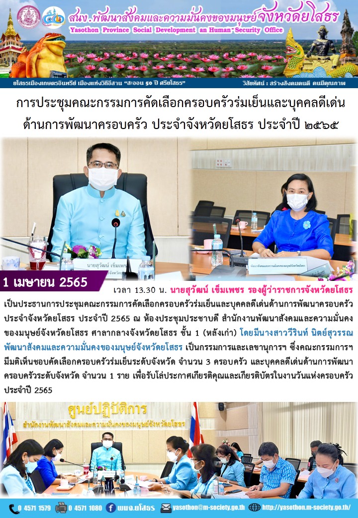 ประชุมคณะกรรมการคัดเลือกครอบครัวร่มเย็นและบุคคลดีเด่นด้านการพัฒนาครอบครัวประจำจังหวัดยโสธร ประจำปี 2565 (1 เมษายน 2565)