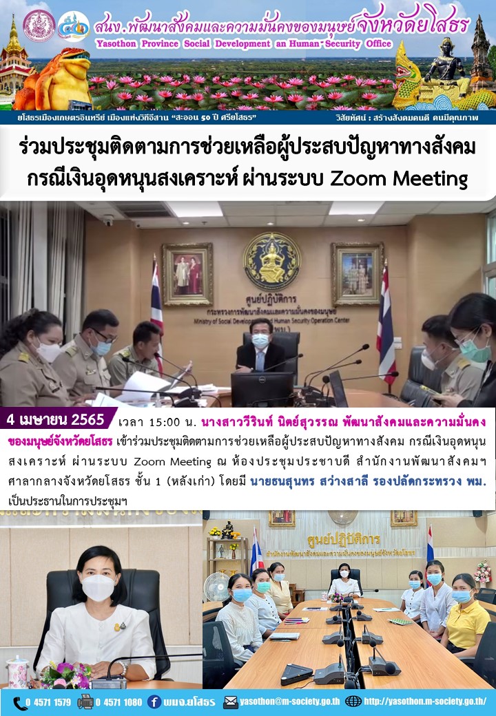 วันที่ 18 เม.ย. 2565 (15:58 น.)วันที่ 4 เมษายน 2565 เวลา 15:00 น. นางสาววีรินท์ นิตย์สุวรรณ พัฒนาสังคมและความมั่นคงของมนุษย์จังหวัดยโสธร เข้าร่วมประชุมติดตามการช่วยเหลือผู้ประสบปัญหาทางสังคม กรณีเงินอุดหนุนสงเคราะห์ ผ่านระบบ Zoom Meeting ณ ห้องประชุมประชาบดี สำนักงานพัฒนาสังคมฯ ศาลากลางจังหวัดยโสธร ชั้น 1 (หลังเก่า) โดยมี นายธนสุนทร สว่างสาลี รองปลัดกระทรวง พม. เป็นประธานในการประชุมฯ