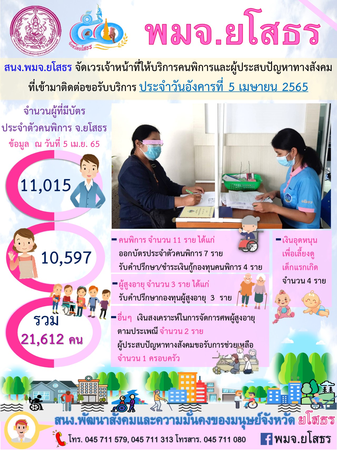 สนง.พมจ.ยโสธร จัดเวรเจ้าหน้าที่ให้บริการคนพิการและผู้ประสบปัญหาทางสังคม ที่เข้ามาติดต่อขอรับบริการ (5 เมษายน 2565)