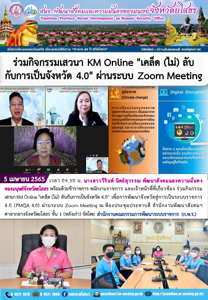 วันที่ 19 เม.ย. 2565 (10:33 น.)วันที่ 5 เมษายน 2565 เวลา 09.30 น. นางสาววีรินท์ นิตย์สุวรรณ พัฒนาสังคมและความมั่นคงของมนุษย์จังหวัดยโสธร พร้อมด้วยข้าราชการ พนักงานราชการ และเจ้าหน้าที่ที่เกี่ยวข้อง ร่วมกิจกรรมเสวนา KM Online "เคล็ด (ไม่) ลับกับการเป็นจังหวัด 4.0“ เพื่อการพัฒนาจังหวัดสู่การเป็นระบบราชการ 4.0 (PMQA 4.0) ผ่านระบบ Zoom Meeting ณ ห้องประชุมประชาบดี สำนักงานพัฒนาสังคมฯ ศาลากลางจังหวัดยโสธร ชั้น 1 (หลังเก่า) จัดโดย สำนักงานคณะกรรมการพัฒนาระบบราชการ (ก.พ.ร.)