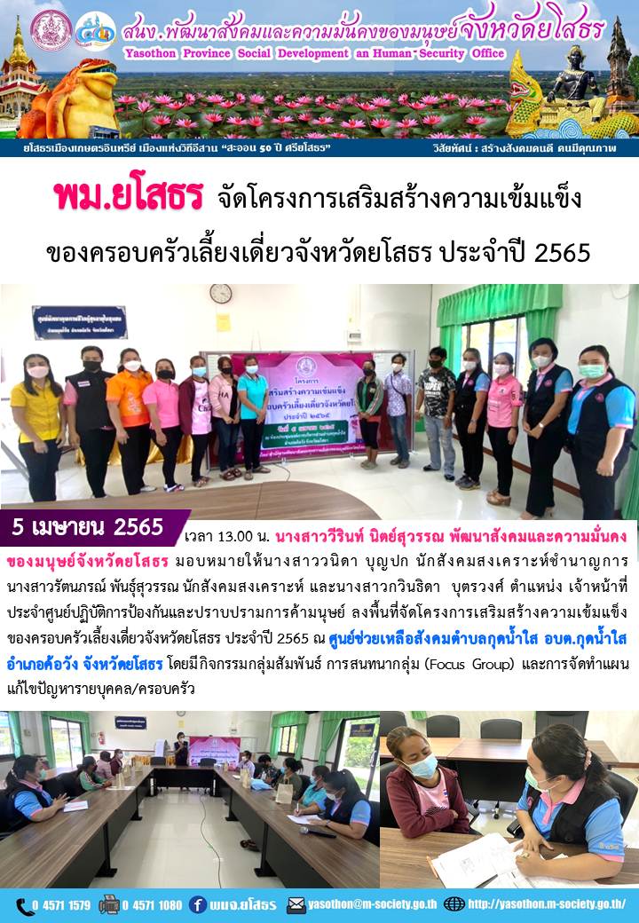 พม.ยโสธร จัดโครงการเสริมสร้างความเข้มแข็ง ของครอบครัวเลี้ยงเดี่ยวจังหวัดยโสธร ประจำปี 2565 ณ ศูนย์ช่วยเหลือสังคมตำบลกุดน้ำใส (5 เมษายน 2565)