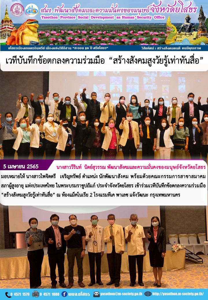 วันที่ 19 เม.ย. 2565 (10:49 น.)วันที่ 5 เมษายน 2565 นางสาววีรินท์ นิตย์สุวรรณ พัฒนาสังคมและความมั่นคงของมนุษย์จังหวัดยโสธร มอบหมายให้ นางสาวไพจิตตรี เจริญทรัพย์ ตำแหน่ง นักพัฒนาสังคม พร้อมด้วยคณะกรรมการสาขาสมาคมสภาผู้สูงอายุ แห่งประเทศไทย ในพระบรมราชูปถัมภ์ ประจำจังหวัดยโสธร เข้าร่วมเวทีบันทึกข้อตกลงความร่วมมือ "สร้างสังคมสูงวัยรู้เท่าทันสื่อ" ณ ห้องแม็คโนเรีย 2 โรงแรมทีเค พาเลช แจ้งวัฒนะ กรุงเทพมหานคร