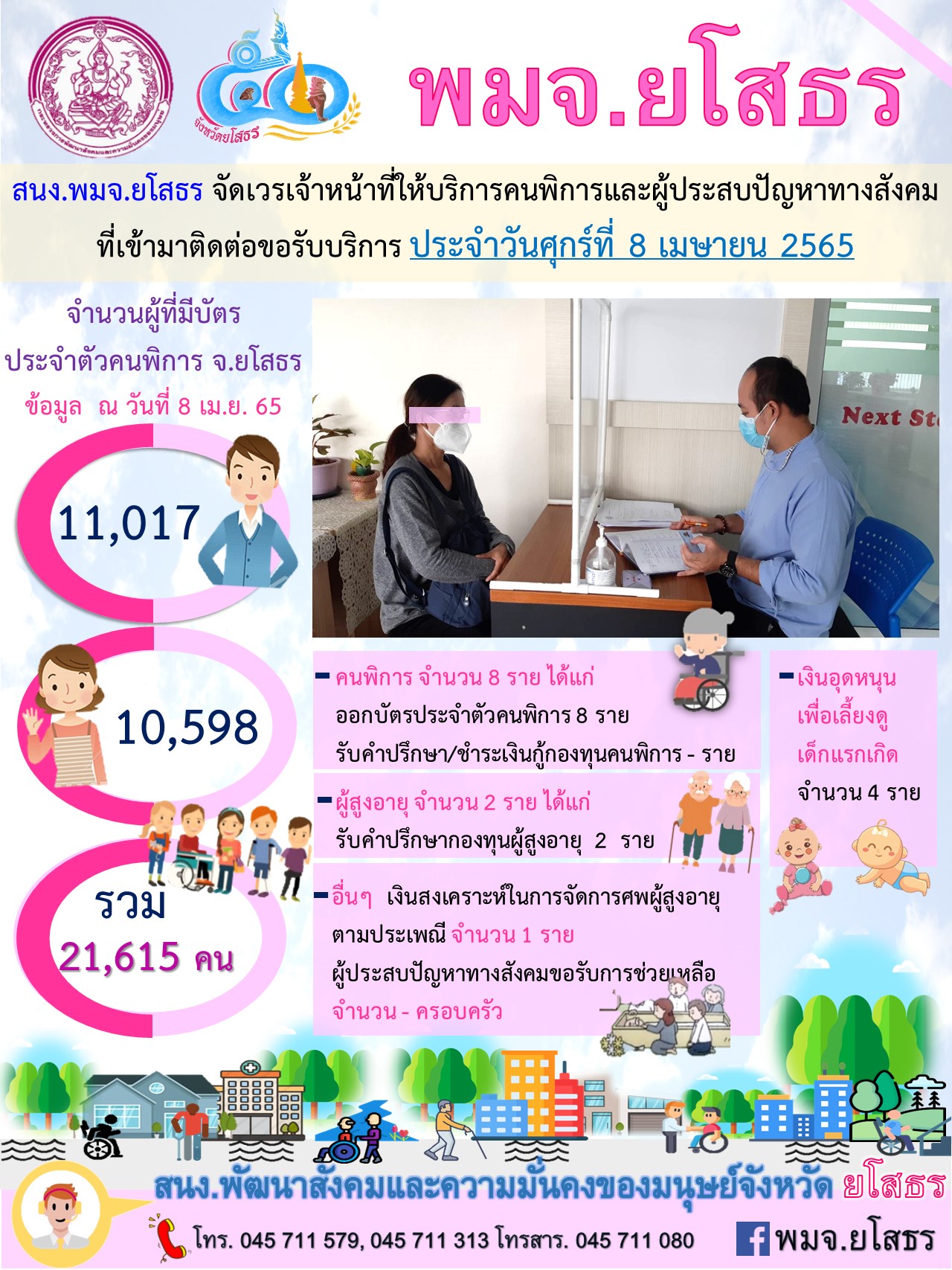 สนง.พมจ.ยโสธร จัดเวรเจ้าหน้าที่ให้บริการคนพิการและผู้ประสบปัญหาทางสังคม ที่เข้ามาติดต่อขอรับบริการ (8 เมษายน 2565)