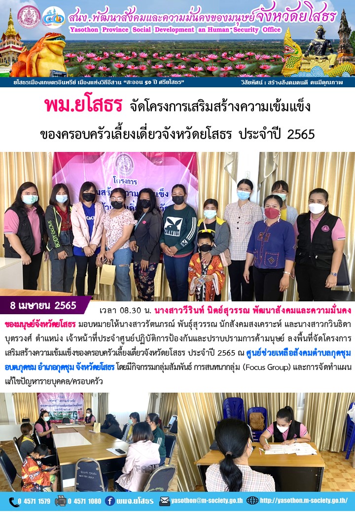 พม.ยโสธร จัดโครงการเสริมสร้างความเข้มแข็ง ของครอบครัวเลี้ยงเดี่ยวจังหวัดยโสธร ประจำปี 2565 ณ ศูนย์ช่วยเหลือสังคมตำบลกุดชุม (8 เมษายน 2565)