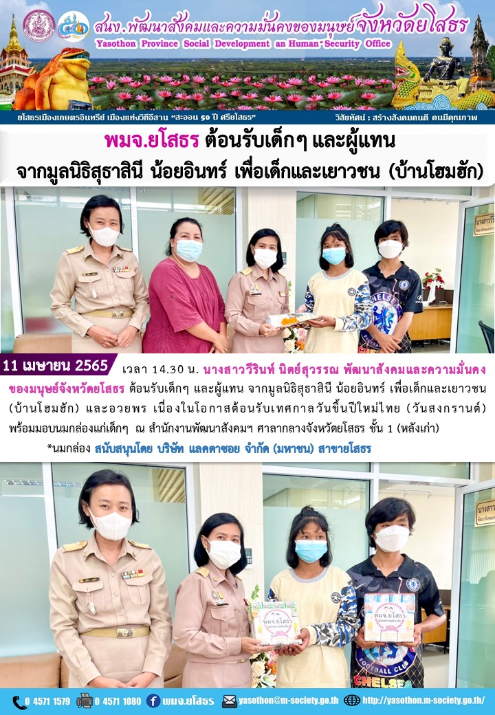 พมจ.ยโสธร ต้อนรับเด็กๆ และผู้แทน จากมูลนิธิสุธาสินี น้อยอินทร์ เพื่อเด็กและเยาวชน (บ้านโฮมฮัก) (11 เมษายน 2565)