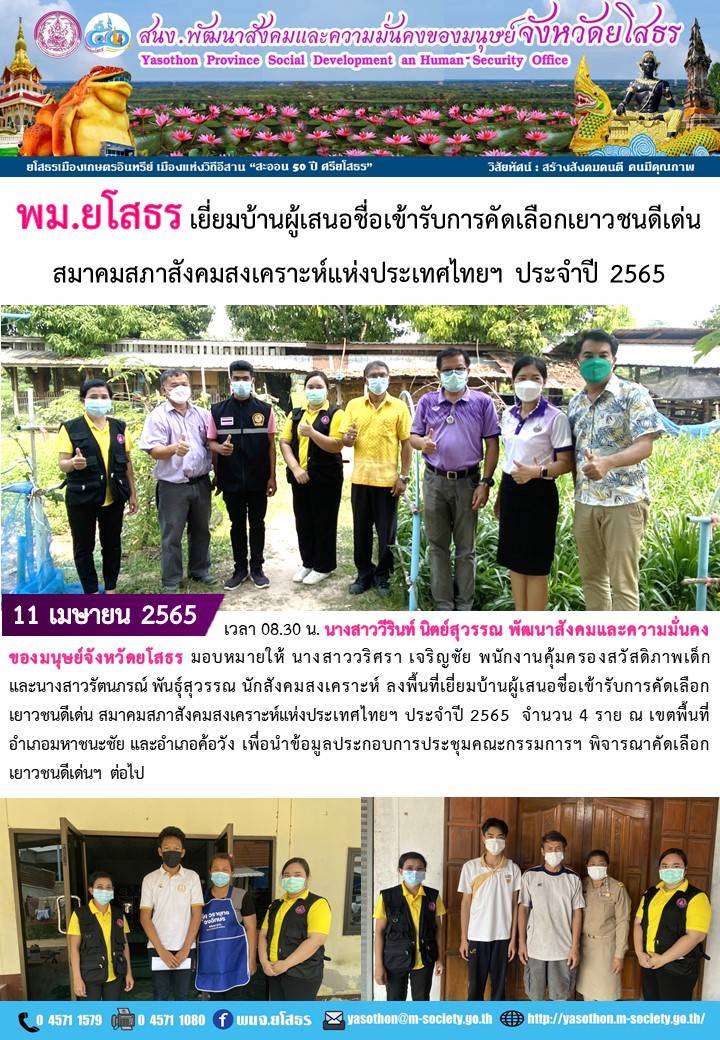 พม.ยโสธร เยี่ยมบ้านผู้เสนอชื่อเข้ารับการคัดเลือกเยาวชนดีเด่น สมาคมสภาสังคมสงเคราะห์แห่งประเทศไทยฯ ประจำปี 2565 (11 เมษายน 2565)
