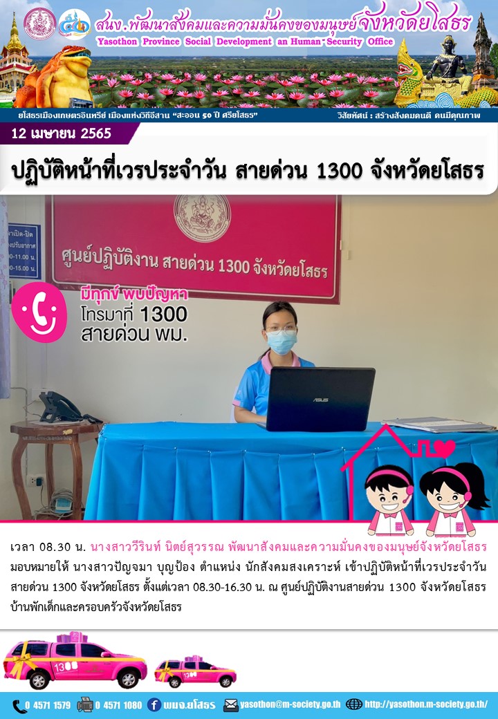 ปฏิบัติหน้าที่เวรประจำวันสายด่วน 1300 จังหวัดยโสธร (12 เมษายน 2565)