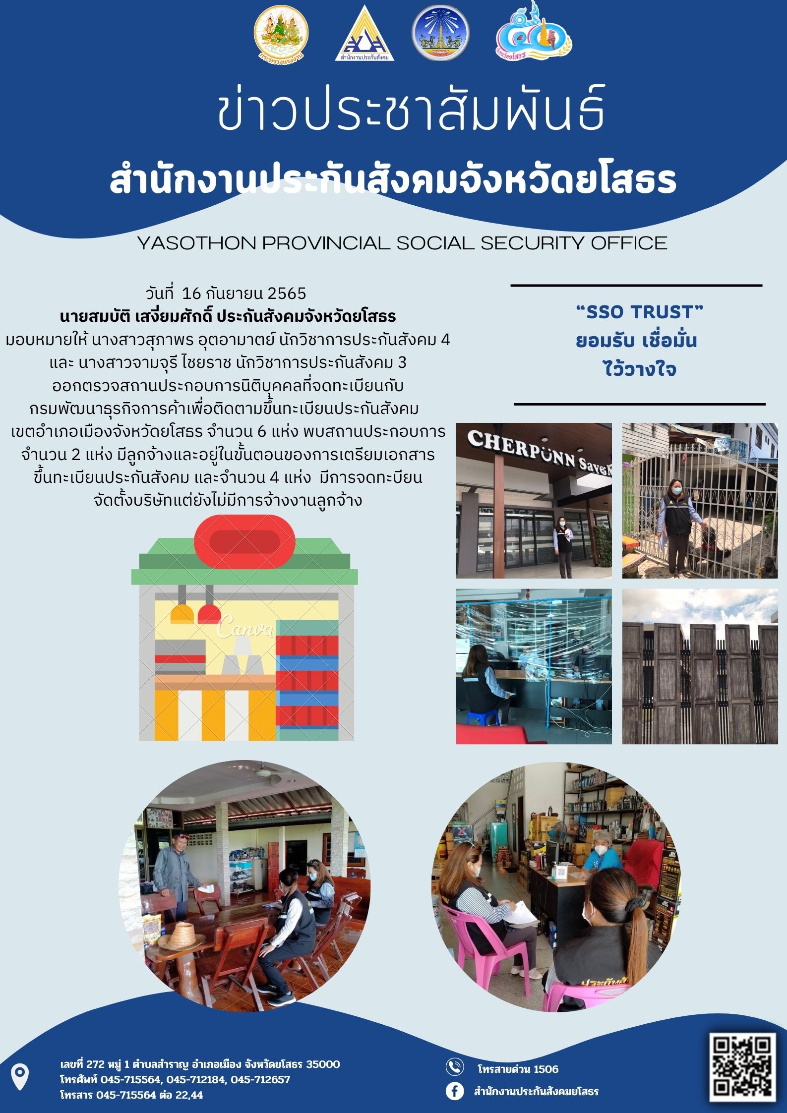 วันที่ 20 เม.ย. 2565 (16:46 น.)วันที่ 20 เมษายน 2565 นายสมบัติ เสงี่ยมศักดิ์ ประกันสังคมจังหวัดยโสธร มอบหมายให้ นางสาวสุภาพร อุตอามาตย์ นักวิชาการประกันสังคม 4 และ นางสาวจามจุรี ไชยราช นักวิชาการประกันสังคม 3
